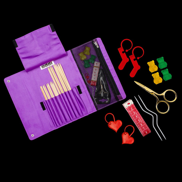 8 Bambus Nadelspiele in 2,5mm, 3,0mm, 3,5mm und 4,0mm in 15cm und 20cm Länge lassen fast keine Wünsche offen. 2 leere Fächer im Etui bieten Platz für weitere Nadelspiele. In der innenliegenden Tasche findet sich nützliches Zubehör wie die Nähschere Goldmarie, ein 150cm Maßband, 4 Maschenbären in grün und gelb, 2 addiLove Herz-Maschenmarkierer, 2 addiMarker Socken-Maschenmarkierer, 1 Zopfmusternadel in 2,5mm und 1 Stopfnadel.